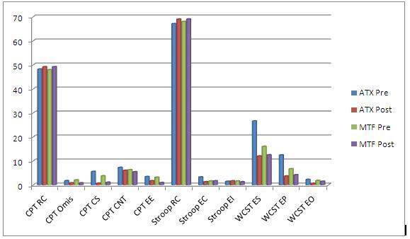 Gráfico I. Resumen de resultados de CPT, Stroop y WCST pre- y post- tratamiento para grupo ATX y grupo MTF.
