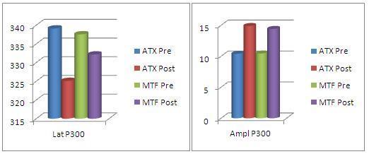 Gráficos II y III. Valores de Latencia y Amplitud P300 en Cz pre- y post- tratamiento para grupo ATX y grupo MTF.